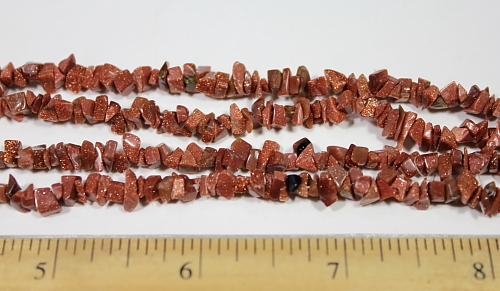 LN100b This is a pretty, sparkly Goldstone chip bead necklace. These beads have a good polish and average 5 to 6 mm in size. This strand is 35" in length. Goldstone is a man made stone but very pretty. |