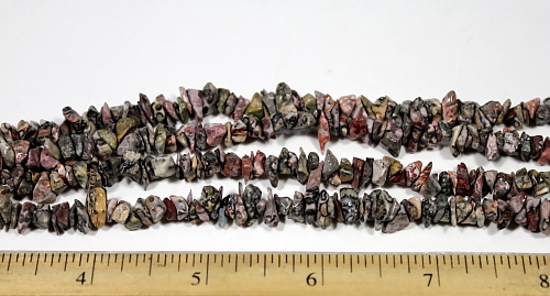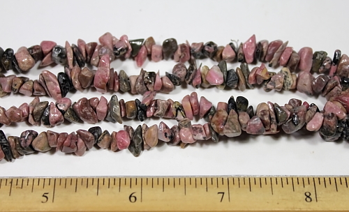 LN106b A pretty strand of Pink Rhodonite chip beads. These beads are nicely shaped, well polished and average 5 to 6 mm in size. They are nice quality chip beads. This strand is 34" in length. |