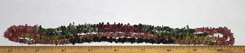 LN105b This is a pretty tri-colored Tourmaline chip bead necklace. These beads are nicely shaped, well polished and average 5 to 6 mm in size. They are nice quality chip beads. This strand is 34" in length. |