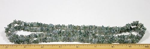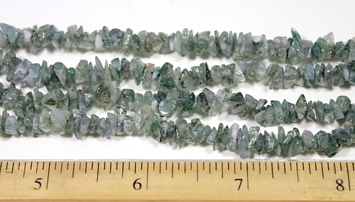 LN107b A pretty strand of Green Moss Agate chip beads. These beads are nicely shaped, well polished and average 5 to 6 mm in size. They are nice quality chip beads. This strand is 34" in length. |