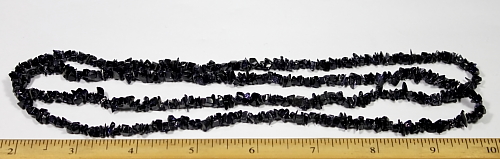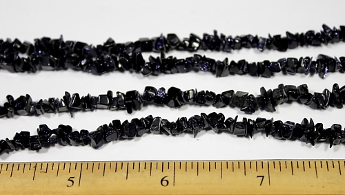 LN200b This is a pretty sparkly, dark blue Goldstone chip bead necklace. These are small chip beads with a good polish and average 4 to 5 mm in size. This strand is 35" in length. Goldstone is a man made stone but very pretty. |