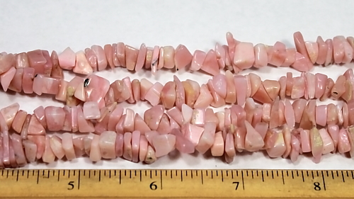 LN201c This is a nice pink Opal chip bead necklace. It is made up pretty soft pink Opal chip beads. These beads have a good polish and average 8 mm in size. This strand is 35" in length. |