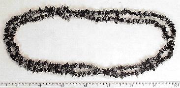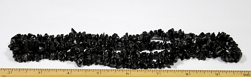 LN204b This is a pretty black Onyx chip bead necklace. These beads have a good polish and average 5 to 6 mm in size. This strand is 35" in length. |