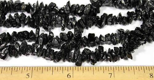 LN503b This is a pretty Snowflake Obsidian chip bead necklace. These beads have a good polish and average 5 to 6 mm in size. This strand is 35" in length. |