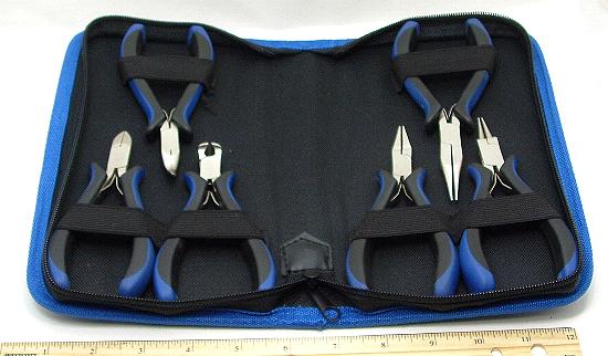 1WR2 This is a pliers tool set with a durable polyester case. A set of six steel pliers: bent-nose, chain-nose, round-nose, flat-nose, side-cutter and end-cutter. Pliers are approximately 5-inches long with plastic, ergonomic handles. Polyester case is black with blue trim, matching the handles of the pliers. A nice set for wire wrapping or other jewelry work. |