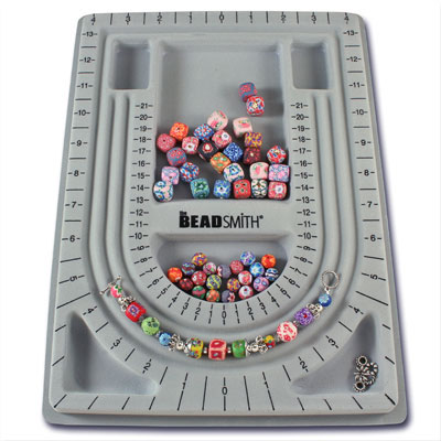 1WR8 This is a Bead Smith Bead Board. Use it to design your own unique bracelets, necklaces & more. It has a flocked surface to help prevent beads from rolling with 6 recessed sections for sorting beads and findings. It has 3 U-shaped channels with measurements that allow you to arrange jewelry supplies and features a removable cover so your project can travel with you. The board measures approximately 9 3/4" x 13 1/4". |