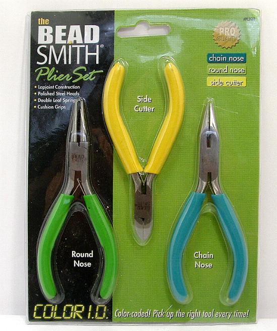 1WR4 This is a set of three piece pliers set by Bead Smith. They include chain nose, round nose pliers and side cutters. Use them for gripping or bending wire, making repairs, or doing tight precision work. Lapjoint construction, polished steel heads, double leaf springs and cushion grips. They are color coded to identify the correct tool every time. |