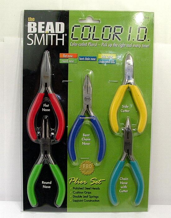 1WR5 This is a set of five piece pliers set by Bead Smith. They include flat nose, chain nose, round nose, bent chain nose pliers and side cutters. Use them for gripping or bending wire, making repairs, or doing tight precision work. Lapjoint construction, polished steel heads, double leaf springs and cushion grips. They are color coded to identify the correct tool every time. |