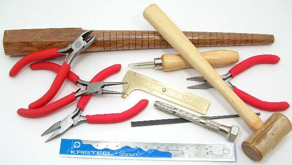 1WR1 This is a basic wire-wrapping kit. All the tools you need to begin wire-wrapping. Use the wire below to acquire and polish your skills. This kit includes: chain-nose, round-nose, flat-nose and side-cutter pliers. A pin vise with 4 interchangeable collet sizes. A wood ring stick, Rawhide mallet, Steel 6" ruler, Brass millimeter gauge, needle file and a steel scribe. |